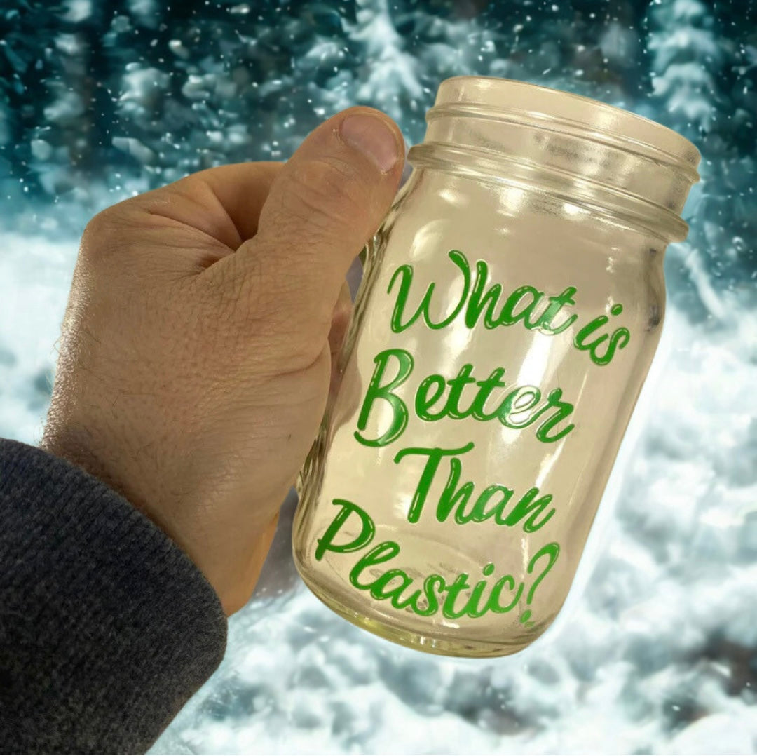 “What Is Better Than Plastic?” Glass Drinking Mason Jar set